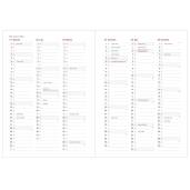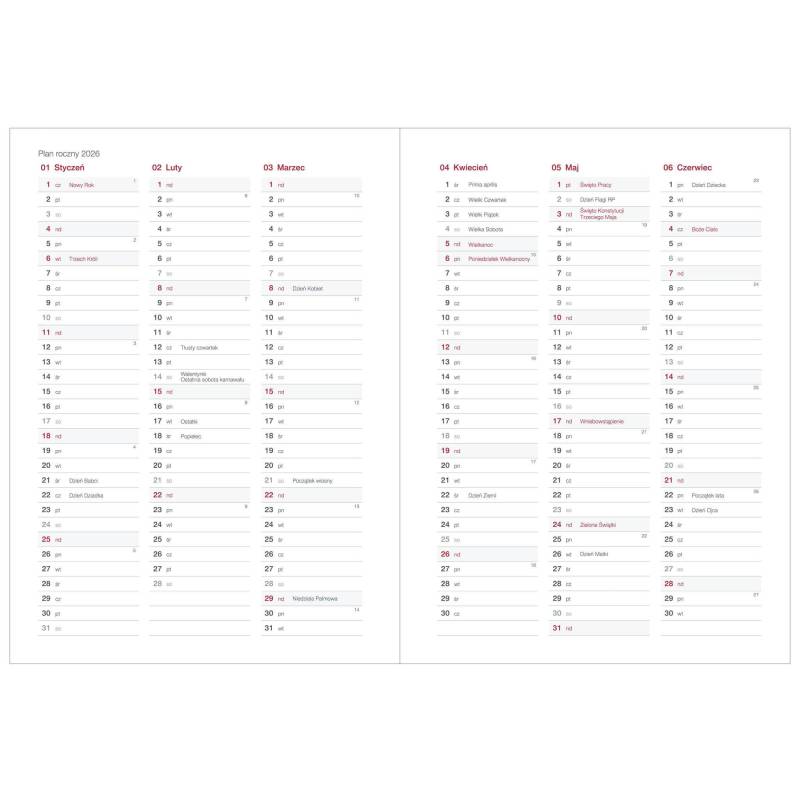 • Terminarz w układzie tygodniowym, drukowany na białym papierze. Kolor druku szary.