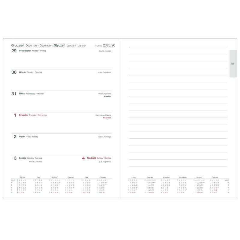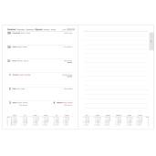 • Terminarz w układzie tygodniowym, drukowany na białym papierze. Kolor druku szary.