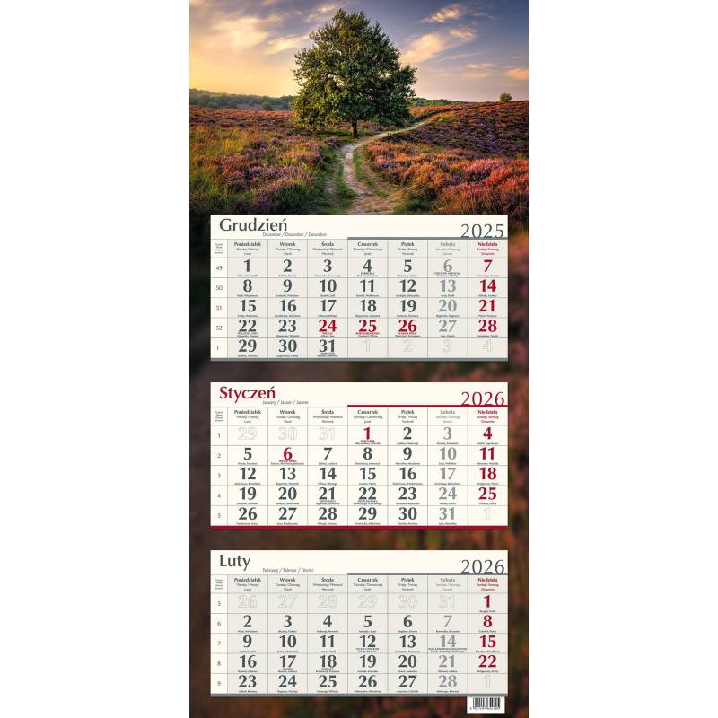 Terminarz trójdzielny format: 315 mm x 860 mm układ kalendarium: 1 miesiąc - 1 kartka, okienko przesuwane.