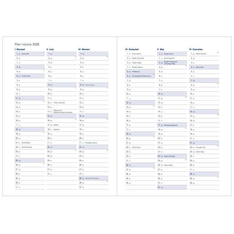 • Terminarz w układzie dziennym, drukowany na papierze białym. Kolor druku szary i granatowy
