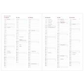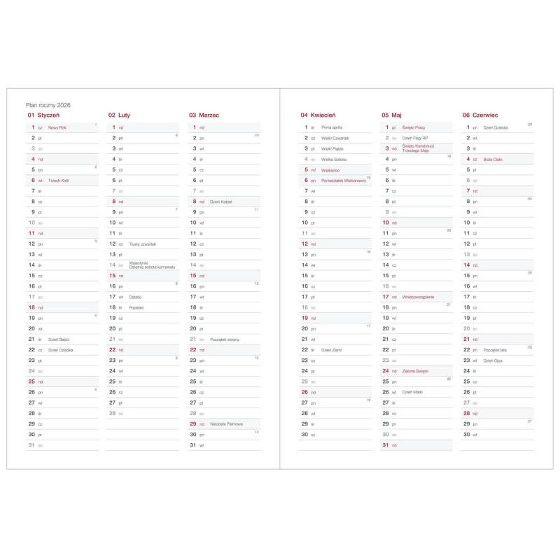 • Terminarz w układzie dziennym, drukowany na papierze białym. Kolor druku szary. Sobota i niedziela na osobnych stronach.