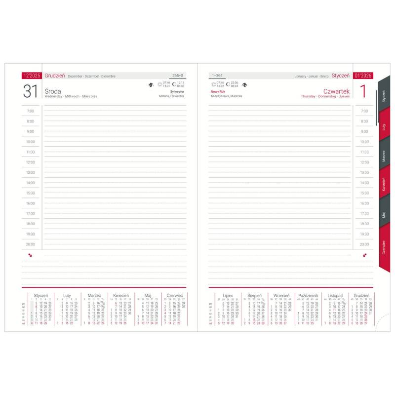 • Terminarz książkowy formatu B5 (171 x 240 mm), objętość 368 stron.  Język: PL/EN/DE/ES.