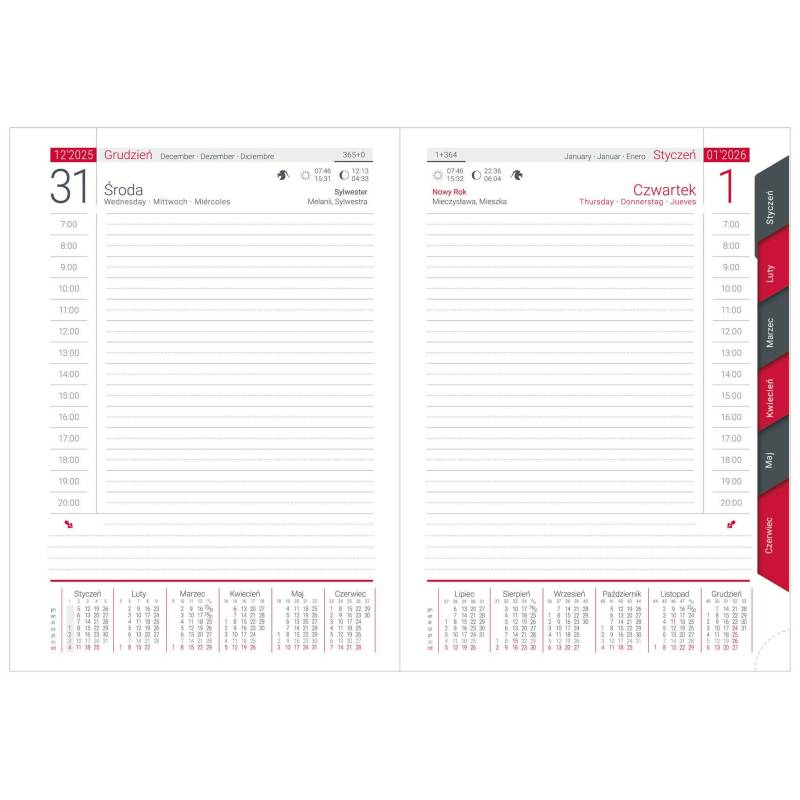 • Terminarz książkowy formatu B5 (171 x 240 mm), objętość 368 stron.  Język: PL/EN/DE/ES.