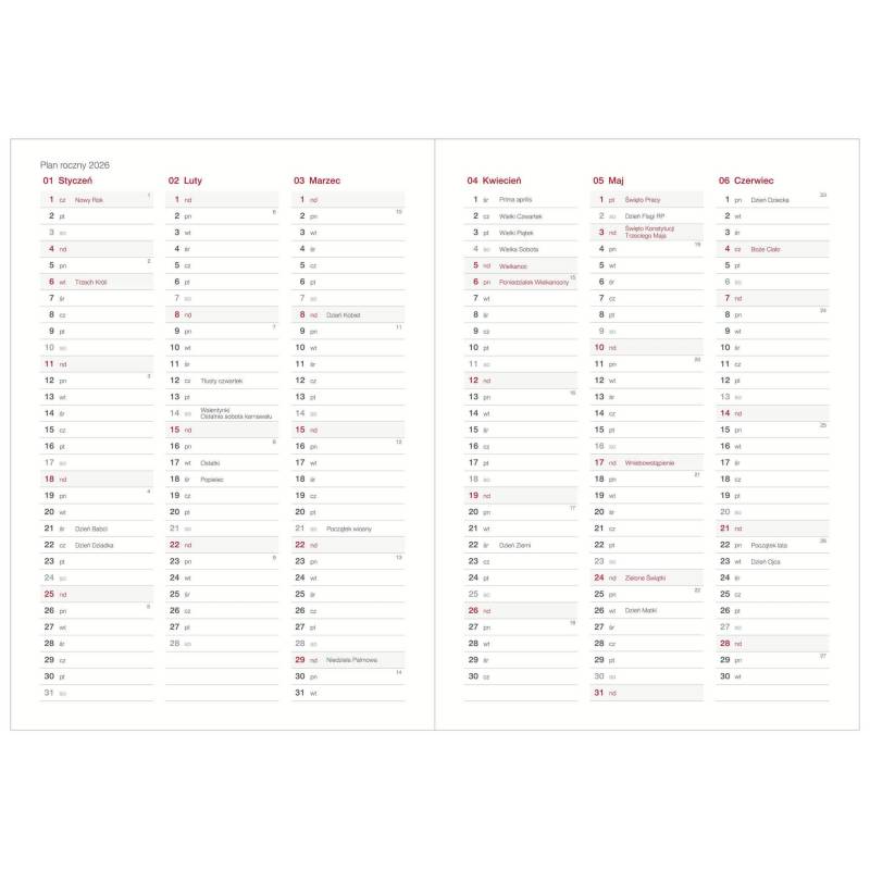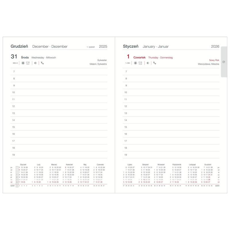 • Terminarz książkowy formatu A5 (144 x 203 mm), objętość 368 stron. Język: PL/EN/DE.