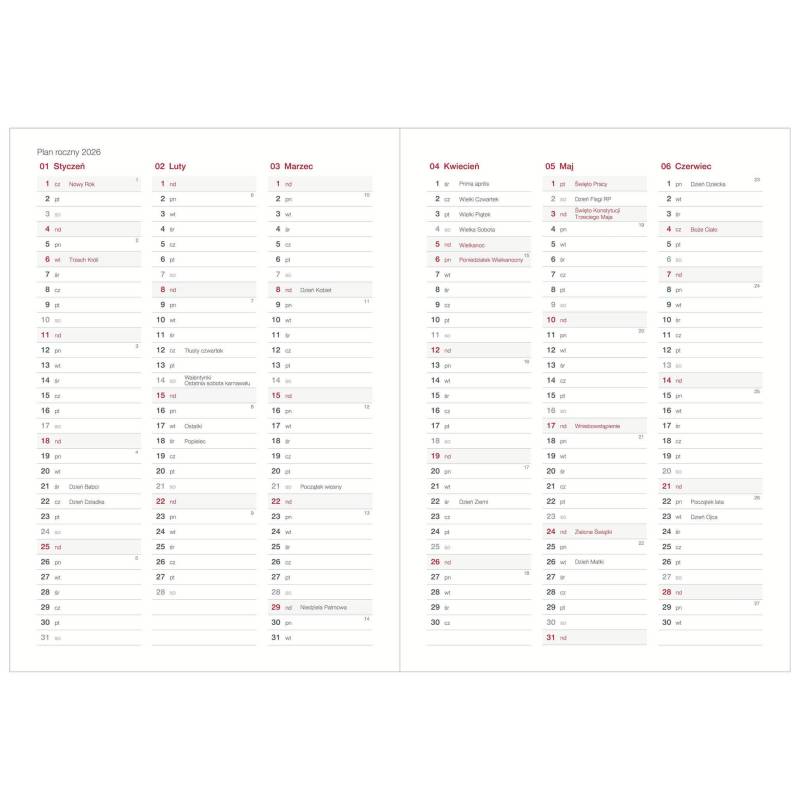 • Terminarz książkowy formatu A5 (144 x 203 mm), objętość 368 stron. Język: PL/EN/DE.