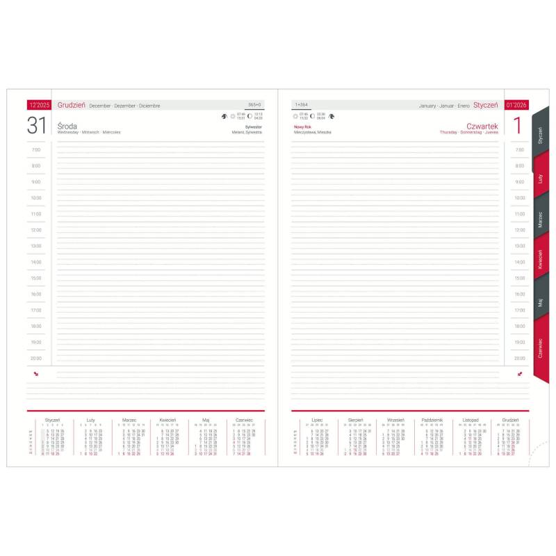 • Terminarz książkowy formatu A4 (201 x 280 mm), objętość 368 stron. Język: PL/EN/DE/ES